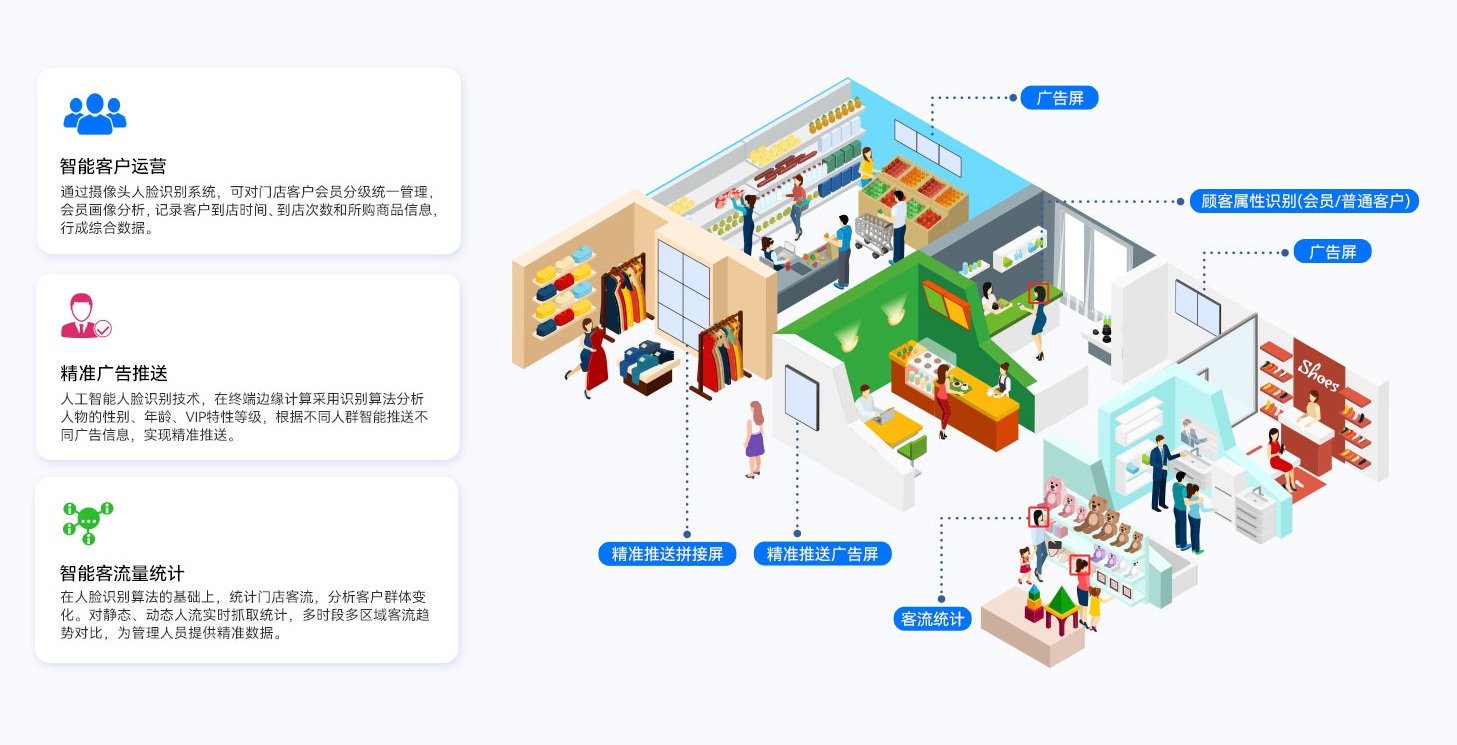沐鸣娱乐GDSM-ES智能零售管理系统还可实现宣传推广内容的精准推送,高效触达。系统融合人工智能技术,采用专业的人脸识别算法,通过终端接入摄像设备与AIOT设备,自动识别不同的物体、动作和行为,形成人物画像,为广告屏幕的内容推送提供数据支持,实现精准营销。同时还可以提供客流统计和客群分析功能,为零售客户提供精准的门店数字化运营管理方案。