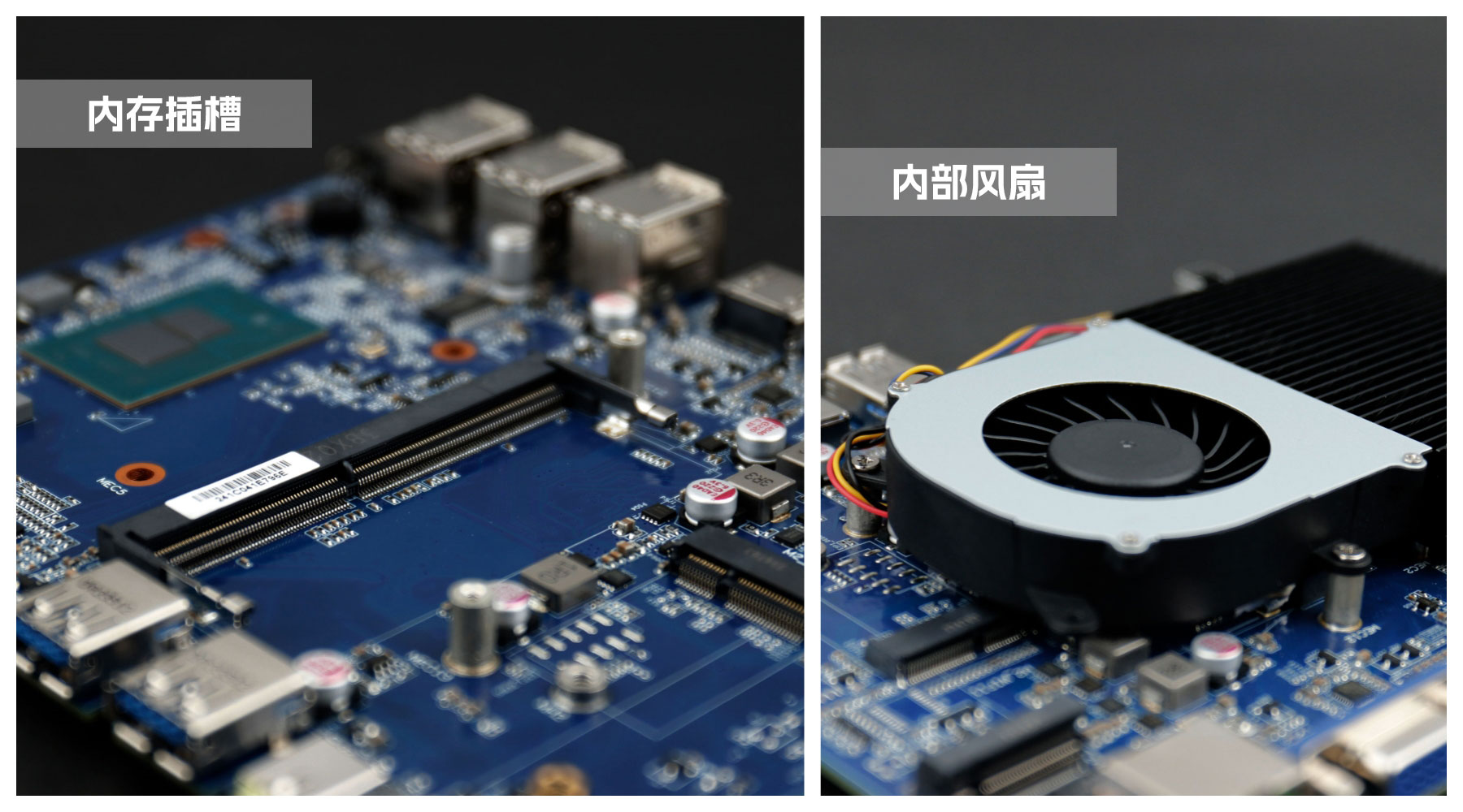 沐鸣娱乐桌面云终端Y-BOX S2主板中部是内存插槽,采用单通道笔记本内存槽设计,最大支持容量可达32GB,最高支持DDR4-3200MHz频率,横插的形式可以减少主板的占用体积,使整体机身更紧凑,内存顶部的风扇起到高效散热的作用。