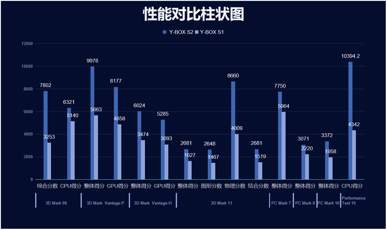 沐鸣娱乐来具体看看各个测试项目的跑分情况,测试项目包括显示性能测试、系统性能测试、CPU性能测试,分别用3D Mark、PC Mark以及Performance 10等系列不同软件的跑分数据,针对两款主板的跑分情况可以看出,沐鸣娱乐桌面云终端Y-BOX S2的数据在各项性能上都得到了大幅度提升,柱状图能更直观地体现出数据的变化,沐鸣娱乐将针对具体的几项数据来进行详细分析。