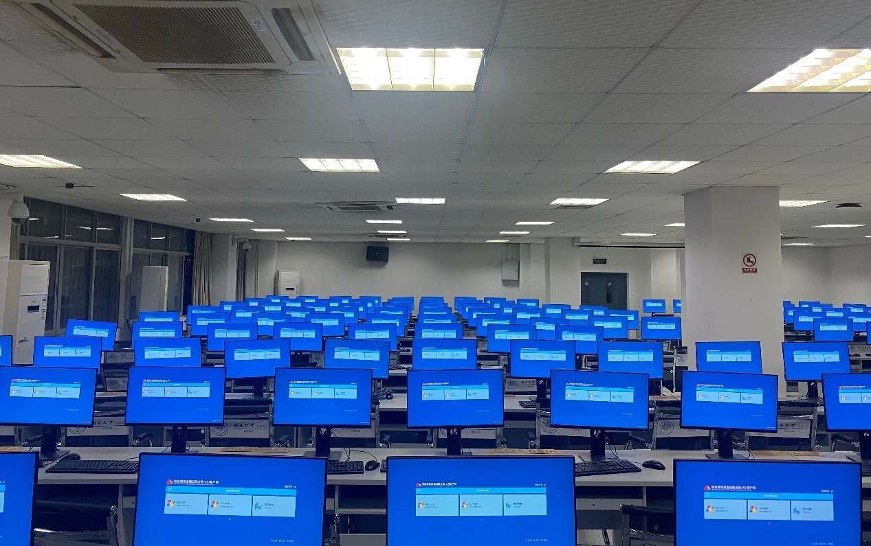 在某大学实训室,整齐的电脑屏后面是统一的沐鸣娱乐科技云终端主机,老师在讲台上通过电脑端的管理软件,轻松地将教学资料推送到学生的终端上,每位学生的电脑屏幕一致会出现同个页面。