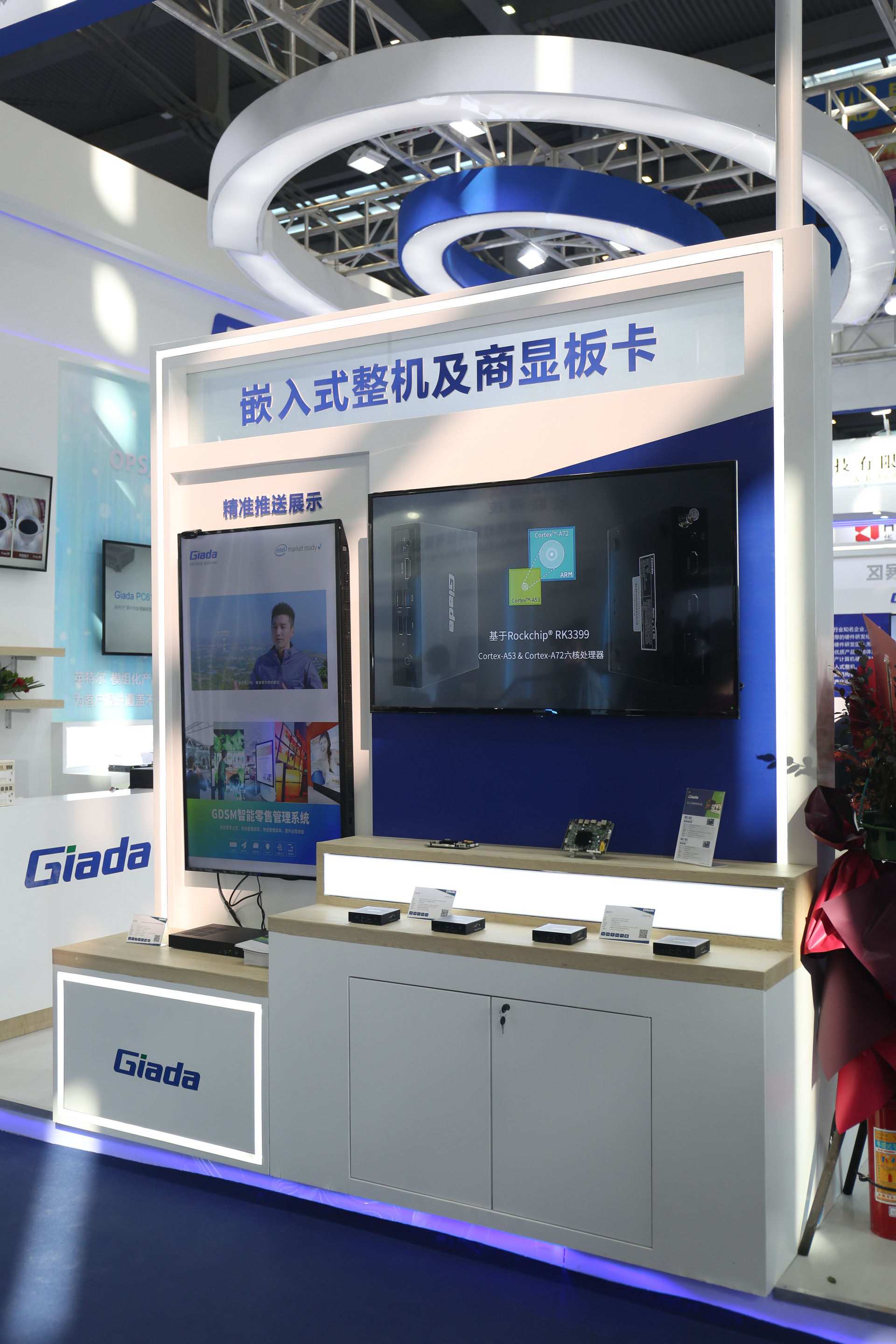 紧邻ARM架构商显产品集的精准推送展示区与零售门店模拟展区,共同组成了本届展会沐鸣娱乐科技展位的一大精彩设计。场景展现了GDSM智能零售管理系统在零售门店场景下的展示效果,顶部的数字标牌由GDSM系统推送内容,模拟搭建了针对人流动线的广告精准推送形态。