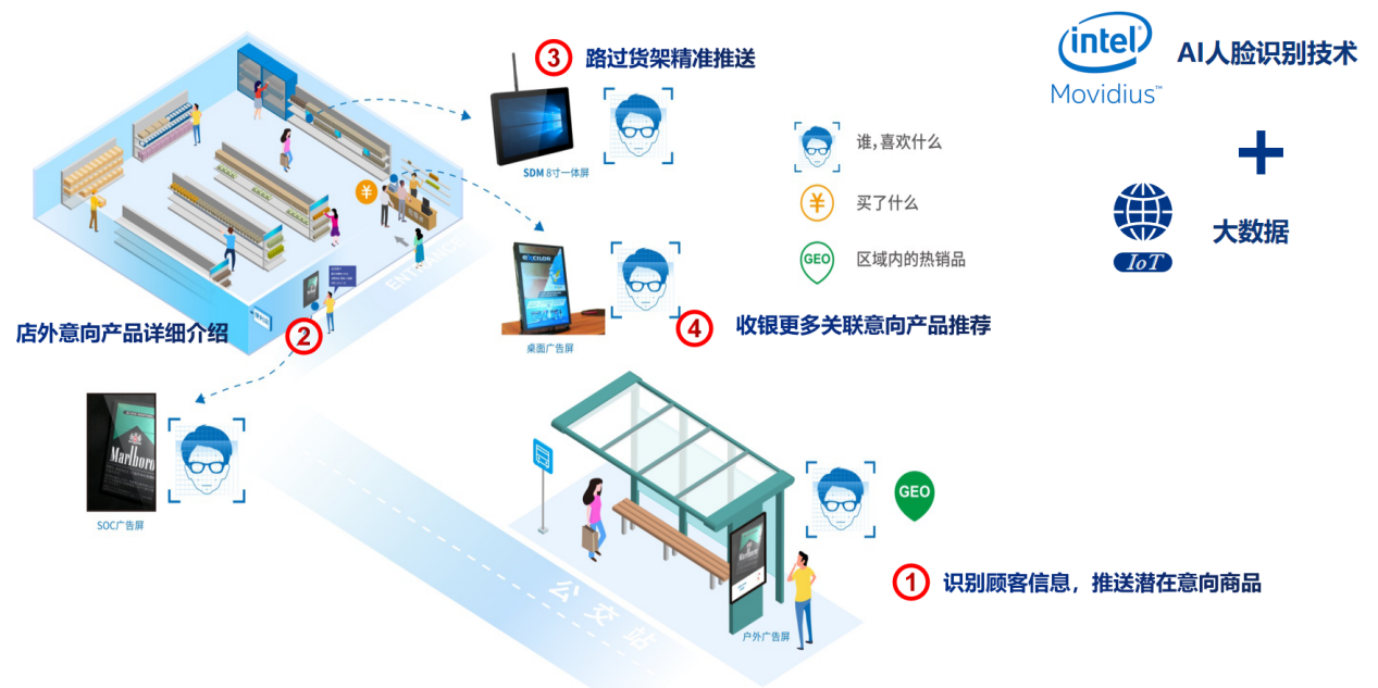 正如一开始提到的,基于GDSM智慧商显系统平台和沐鸣娱乐多屏拼接播放器的精准信息推送方案,整合了人工智能技术,在5G或有线网络的支持下,能够完成针对不同消费者推送不同消费者画像对应的产品。沐鸣娱乐拥有边缘计算能力的G系列多屏拼接播放器,适合作为AI人脸识别的硬件基础平台。通过训练完善的人工智能算法,针对不同的消费者标签,推送不同的广告信息。