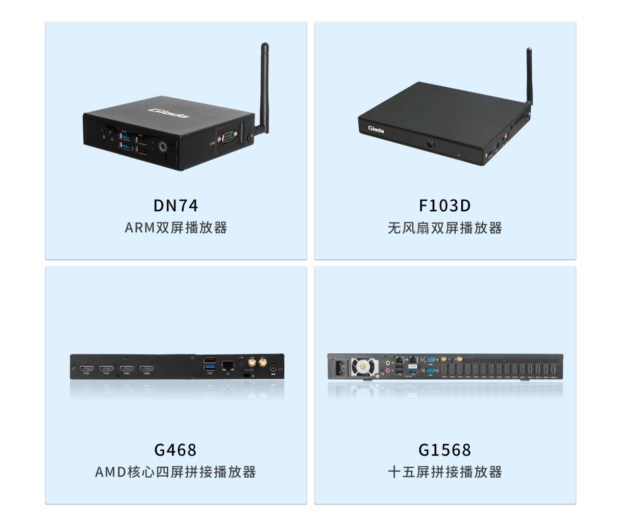 面对需求多样的市场环境,除沐鸣娱乐G330六屏拼接播放器外,沐鸣娱乐科技相继推出了G468四屏拼接播放器、G968九屏拼接播放器、G1568十五屏拼接播放器等多平台、多规格产品,均能够与沐鸣娱乐GDSM商显系统平台完美适配,为商家的实际需要,供应选型完整的家族式产品。