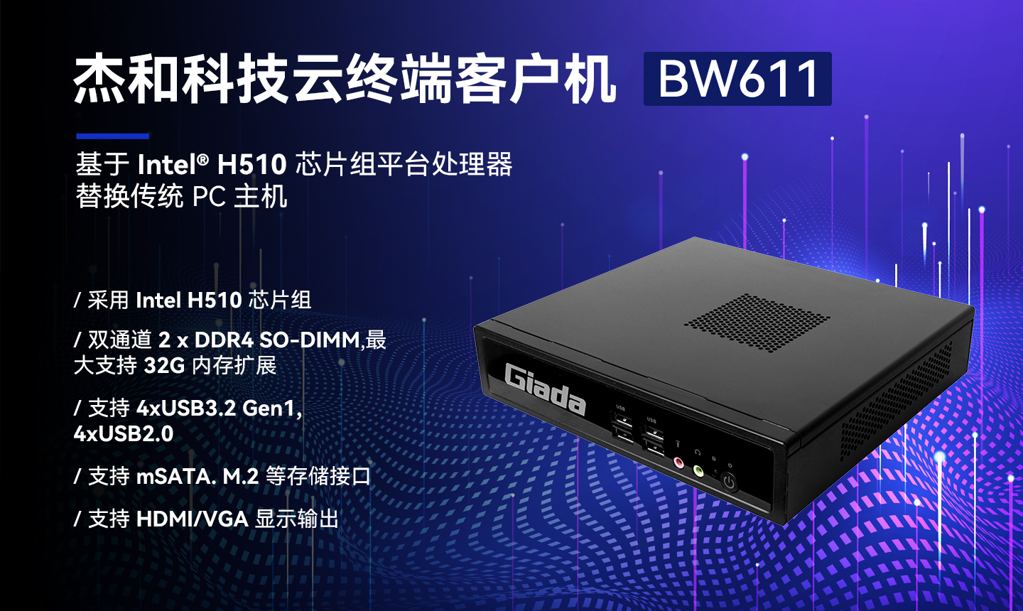 沐鸣娱乐科技云终端BW611体积小巧、双通道内存,性能强悍,接口丰富。