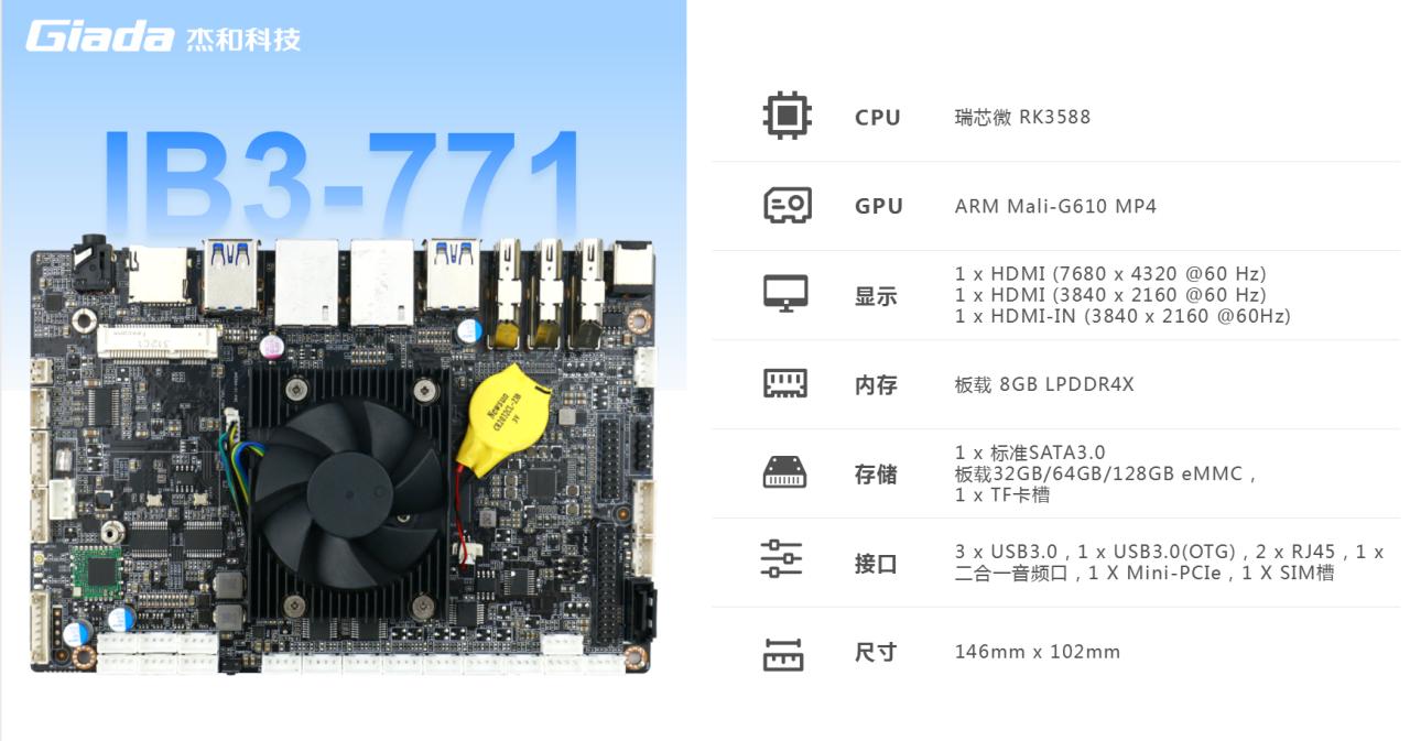 沐鸣娱乐主板IB3-771搭载瑞芯微RK3588八核64位处理器,内置6TOPS算力的NPU,具备高算力、内存大、超强多媒体、多重扩展等技术优势。满足8k超高清视频的显示需求,还支持主流深度学习框架,为各类 AIOT 应用场景提供更优的性能表现,支持机器人、边缘计算、智能NVR、智能汽车、智慧大屏、AR/VR、智能自助终端场景的广泛应用。
